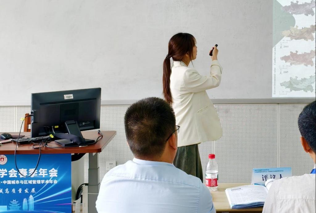 在第75分论坛“智慧土地管理与区域高质量发展”中,公司理论经济学专业研究生李欣雨同学作了题为《基于生态环境质量时间的半干旱区“生产-生活-生态”空间冲突识别、预测与优化——以关中平原城市群为例》的学术报告。报告以“生态环境质量”为切入点,运用空间分析与情景模拟方法,系统探讨了半干旱地区空间冲突特征及其演变趋势,并提出了具有针对性的优化路径。研究成果聚焦区域可持续发展,兼具理论深度与现实指导意义,受到与会专家和同行的积极评价与广泛关注。