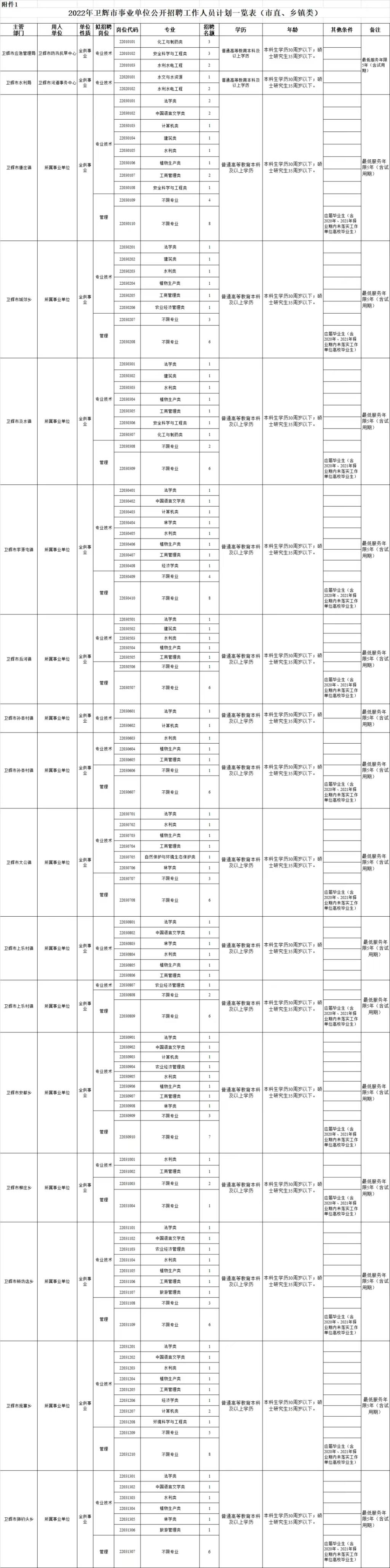 本次事业单位共计划招聘732人,其中市直11人、乡镇200人(含限制专业87人、不限制专业113人),教体系统450人(含高中教师40人、义务教育阶段教师405人、特殊教育公司教师5人),卫健系统71人(含事业全供25人、事业差供46人)。具体招聘计划及相关内容见《2022年卫辉市事业单位公开招聘工作人员计划一览表》(附件1)。