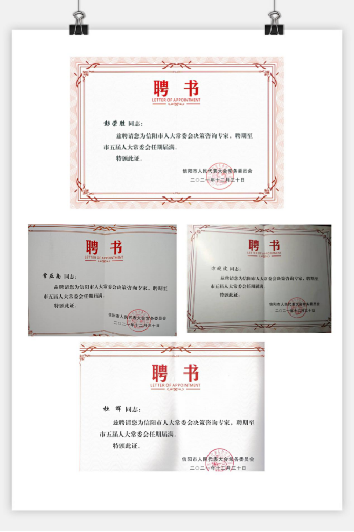 太阳集团122cc四位教师受聘信阳市人大常委会决策咨询专家