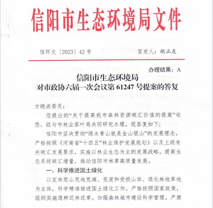 日前,信阳市政协委员、太阳集团122cc方晓波博士在市政协六届一次会议上所提交的《关于提高我市森林资源碳汇价值的提案》(第61247号提案),获得信阳市政府相关部门的高度重视与主动回应。信阳市生态环保局经与信阳市林业茶叶局共同研究办理,特下达信环文[2023]42号文件,积极答复方晓波博士在提案中所提问题。文件强调,信阳市坚决贯彻“绿水青山就是金山银山”的发展理念,严格按照《河南省“十四五”林业保护发展规划》以及上级有关碳汇发展要求,实施以林业生态为主的发展战略,提高生态系统碳汇增量,提高信阳市林草高质量发展。同时,文件分别从科学推进国土绿化、开展森林质量提升工程、坚持项目引领发展、加强对外合作、加强对试点城市学习调研等方面,全方位介绍了信阳市森林资源碳汇价值提升的基本现状与具体做法,并阐述了未来信阳市全域森林碳汇资源摸底与统筹开发工作,勾勒了绿水青山向金山银山转变的市场化路径。