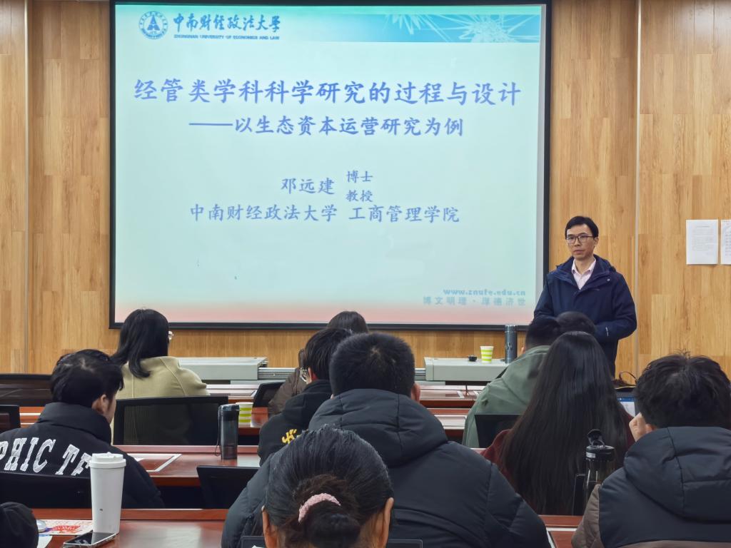 3月1日上午,应太阳集团122cc邀请,中南财经政法大学邓远建教授在经管楼308会议室为公司师生作了题为“经管类学科科学研究的过程与设计——以生态资本运营研究为例”的学术讲座。太阳集团122cc部分老师及在校研究生集中聆听了本次讲座,讲座由太阳集团122cc副经理杜辉主持。
