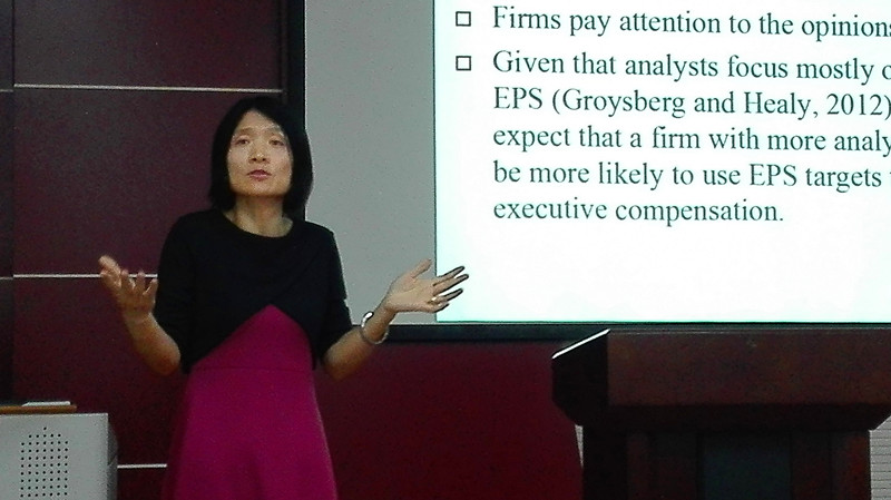 报告会中,程颖梅教授就公司CEO的薪酬与EPS-Linking指标之间关系进行阐述,指出如果公司采用EPS-Linking指标来确定CEO薪酬,则会对公司产生一定负面影响。经研究可知,公司规模越大、顾问数量越多,公司采用EPS-Linking指标的可能性越大。如何防止这种问题带来的负面影响至关重要,有待进一步研究。