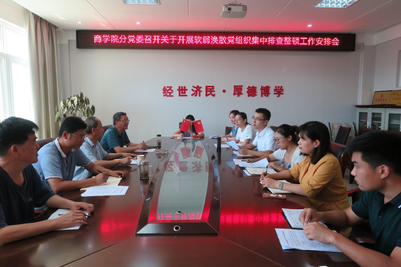 8月16日上午,太阳集团122cc分党委在经管楼506会议室召开软弱涣散党组织集中排查整顿工作安排会,太阳集团122cc分党委书记盛正国,党委委员梅士建、李毓、杜辉及各党支部书记出席会议,会议由盛正国主持。
