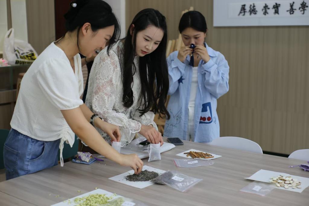 活动现场,工作人员提前备齐了丰富的制作材料:长案上铺陈着各色绸缎、丝线、流苏配件,青瓷盏中艾叶、丁香、藿香等香草散发着清芬。在专业示范指导下,参与师生按照裁剪布料、缝制袋口、填充香料、装饰流苏的步骤,专注制作每一个香囊,指尖穿梭间,绸缎与香草的气息交织成端午特有的文化韵律。最后,黄钰莹代表公司向员工赠送粽子等礼物,用传统美食传达端午安康的诚挚祝福。