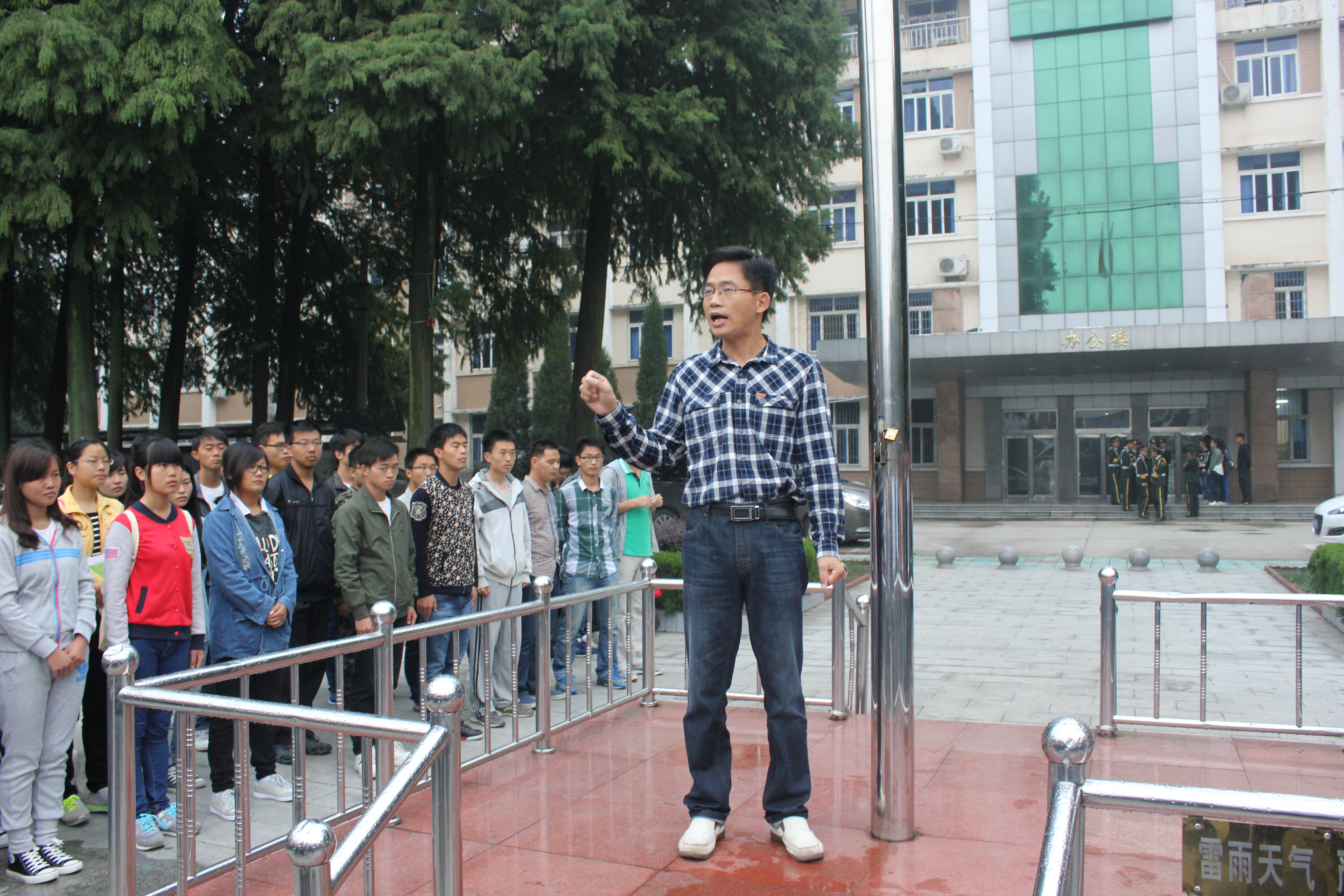 9月27日上午8时,经济公司员工干部在校团委的带领下步行前往红军广场,同学们冒雨前行,历经一个小时的路程来到了鄂豫皖革命纪念馆。