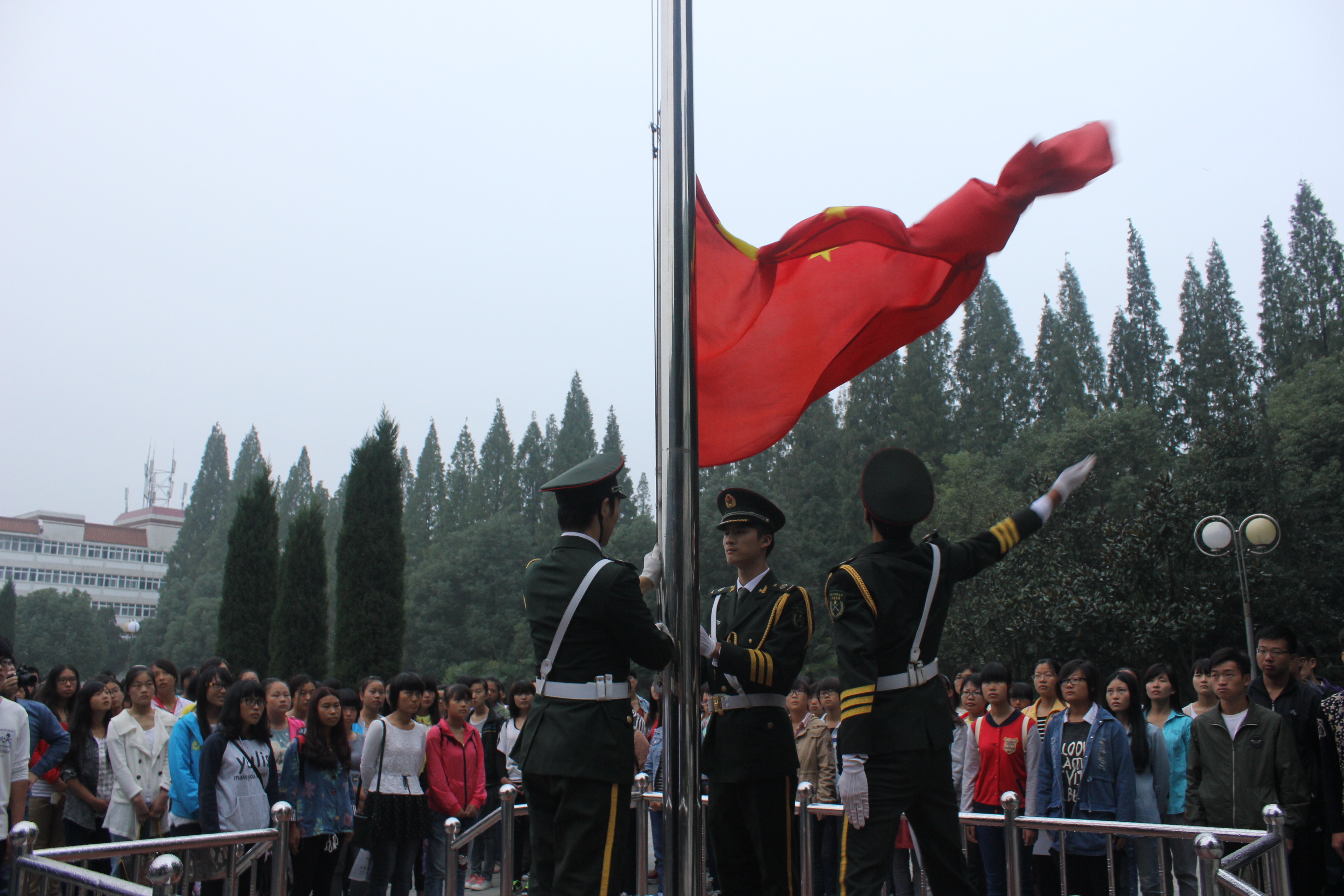 不少员工早早就等候在国旗台前,6点10分活动在主持人的深情朗诵中拉开帷幕。活动中全体师生与国旗合影,注目并仰望国旗徐徐升起;面向国旗宣誓,振臂高呼时代口号;在“缅怀革命先烈、喜迎祖国华诞、共筑中国梦”条幅上留言签字。在面对国旗宣誓环节,同学们表情严肃、语言铿锵有力,誓言不忘先烈丰功伟绩,积极担起青春使命。在面对国旗高呼时代口号环节,房书记先与大家一起回顾了1840年鸦片战争特别是1937年全面抗战以来,在挽救民族危亡的历程中,无数仁人志士坚守“祖国不亡,有我!”的时代誓言,为国家和民族抛头颅洒热血;他指出新时代我们仍在冒着敌人的炮火前进,应该铭记“祖国的繁荣富强我负责”这一属于当今青年学子的时代口号,并带领师生振臂三呼“祖国的繁荣富强我负责”,声音响彻校园上空。