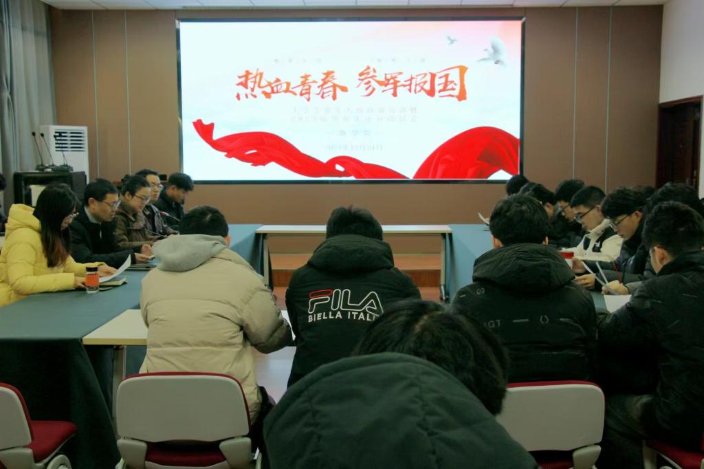 为贯彻落实国家征兵政策,鼓励在校老员工积极投身军旅,12月24日,太阳集团122cc于经管楼310会议室成功举办了“热血青春,参军报国”武装征兵动员大会。商公司党委书记李辉、党委副书记黄钰莹、毕业生班主任韩月华、袁巍峰、黄亚俊以及三位退伍老员工共同参加了此次大会。