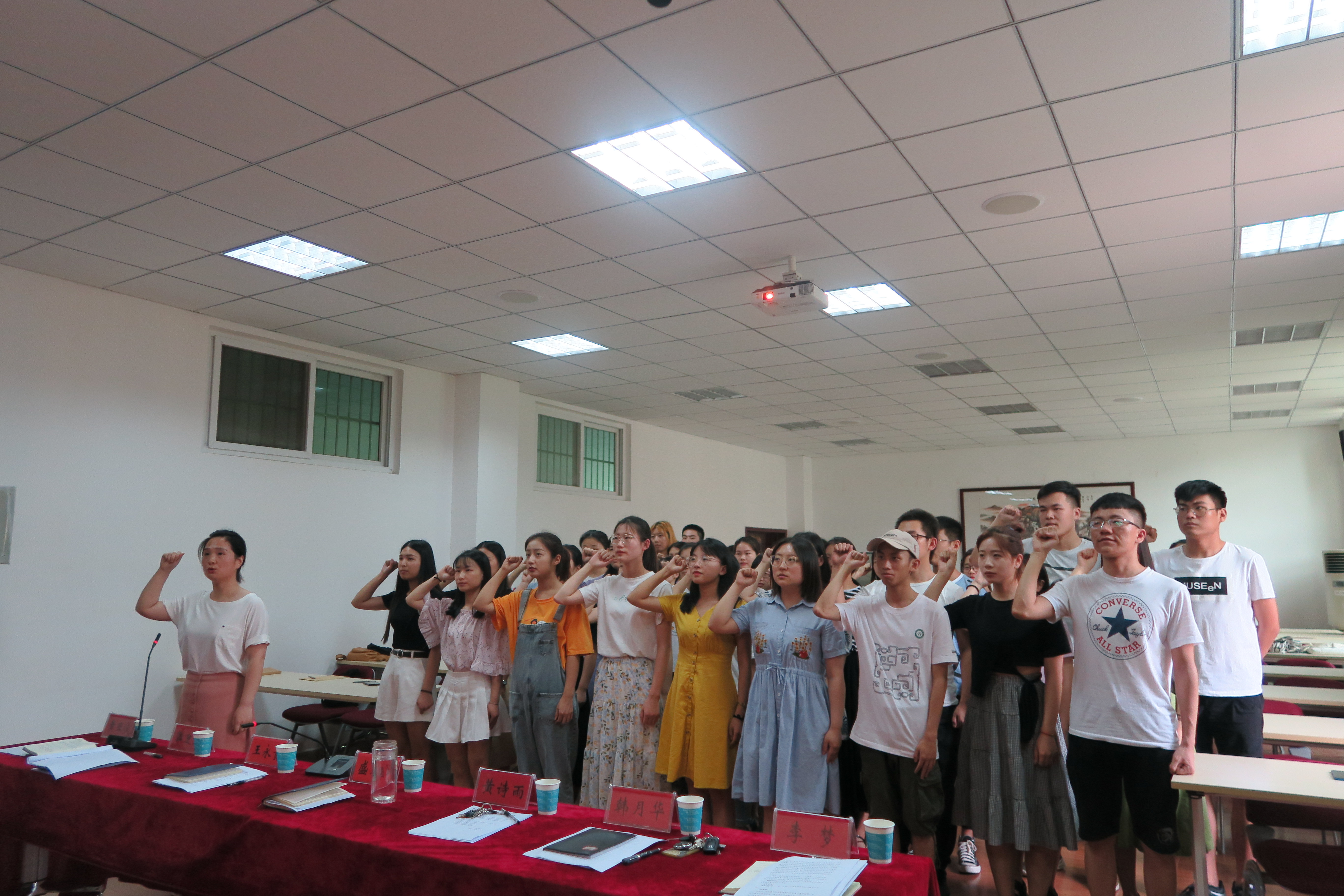 6月24日,我院在经管楼310举办2019上半年预备党员宣誓大会,公司43名预备党员在党旗的见证下光荣的完成了自己的人生的转折点,开启了人生新篇章。商公司党委书记盛正国,副书记王永贵、团委书记黄诗雨、团委老师韩月华、黄亚俊、李梦出席会议,会议由团委老师郭迎亚主持。