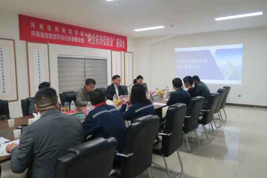 访企拓岗过程中,彭荣胜一行在裕宏包装总经理马智会陪同下参观了裕宏包装及生产现场。参观结束后,彭荣胜一行和河南裕宏新型环保包装有限公司相关负责人进行了座谈。座谈会上,马智会对彭荣胜一行表示欢迎,并详细介绍了公司的成长历程和发展规划。彭荣胜介绍了公司的专业设置、团队建设、团队队伍和人才培养情况。刘义介绍了遂平县营商环境、产业政策。大家就校企合作与校地合作、人才培养与实习就业、企业绿色发展与转型升级、产学研合作等进行了深入细致的沟通交流。随后,彭荣胜、马智会代表双方签属合作协议,举行信阳师范公司“就业创业基地”、“就业实习基地”牌匾授牌仪式。