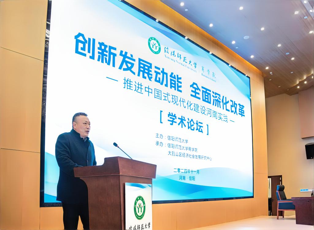 副董事长井强山出席开幕式并致辞。井强山对各位专家学者的到来表示热烈欢迎,向长期以来支持公司发展的学界同仁表示衷心感谢,简要介绍了公司近50年发展历程和高水平师范大学建设现状,具体介绍了近年公司经济管理学科取得的成绩和未来发展规划,着重强调了在全面深化改革和推进中国式现代化建设的新征程上,举办此次论坛有助于深入学习党的二十届三中全会精神,以及贯彻实施习近平总书记关于全面深化改革的一系列新思想、新观点、新论断,继而为高质量建设现代化河南、高水平实现现代化河南提供理论服务。同时,希望与会专家学者对公司经济管理团队建设提出宝贵意见和建议,加强学术交流与合作,并预祝大会取得圆满成功。