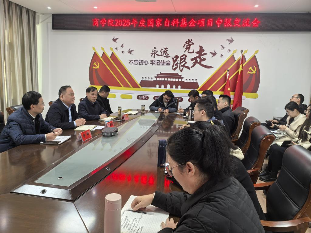 11月26日下午,2025年度国家自然科学基金项目申报交流会在经管楼519会议室召开。校科技处牛继强处长、井艳辉科长一行莅临指导,商公司党委书记李辉、经理彭荣胜、副经理杜辉以及20余位教师参加会议。会议由副经理杜辉主持。